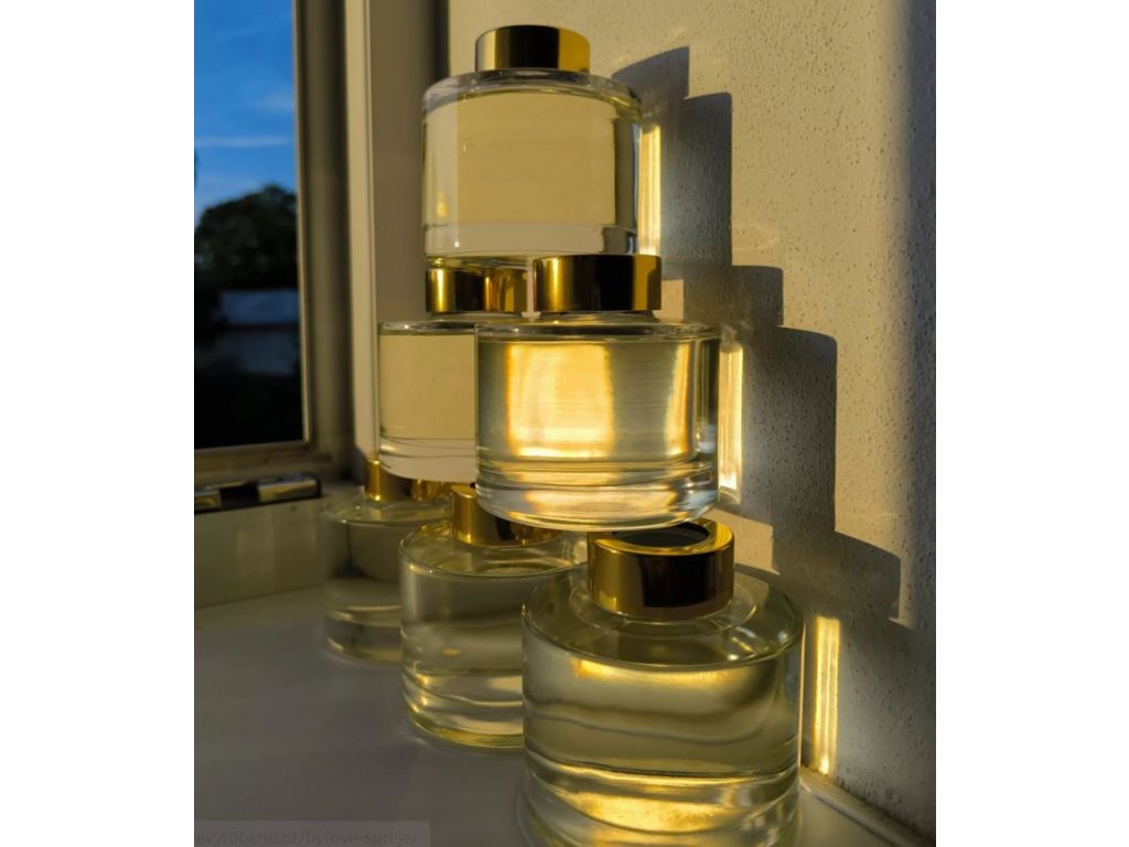 Elegantní mohutná nádoba z čirého skla se zlatým víčkem doplněná o silné tyčinky z bambusu, které díky své tloušťce 6 milimetrů intenzivně provoní prostory a zadržují v sobě dostatečné množství vůně, například oproti běžným tenkým tyčinkám.