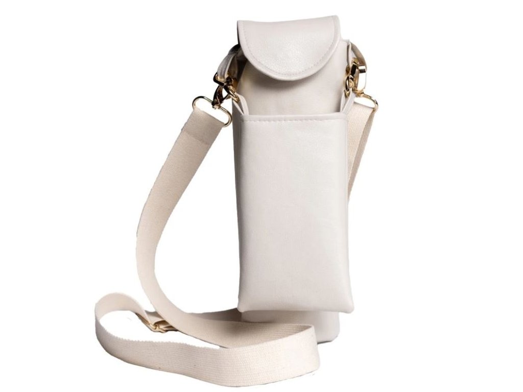 Originální Bottle Bag na láhev. Elegantní způsob jak dodržovat pitný režim celý den a současně doplnit outfit o další jedinečný kousek. Bottle Bag má nastavitelný popruh a vepředu malou taštičku na mobil, klíče, peněženku a další drobnosti, které v průběhu dne budete potřebovat.