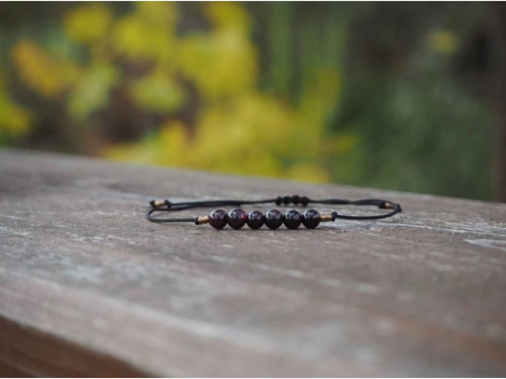 Dámský minimalistický náramek vyrobený ze syntetické šňůrky a korálků přírodního granátu. Náramek je doplněn drobnými japonskými korálky značky Miyuki.