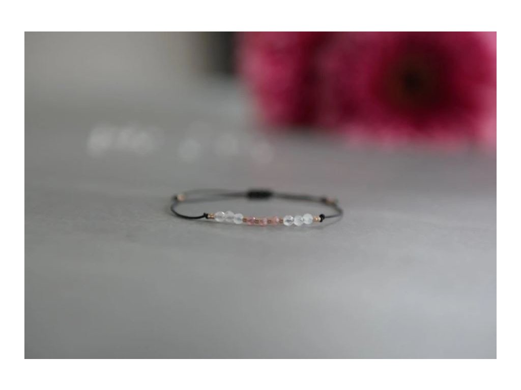 Dámský minimalistický náramek vyrobený ze syntetické šňůrky a korálků broušeného jadeitu a rodochrozitu. Náramek je doplněn drobnými japonskými korálky značky Miyuki.