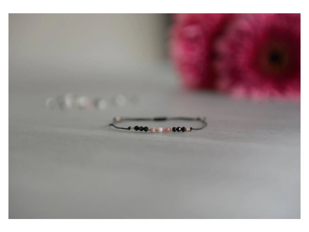 Dámský minimalistický náramek vyrobený ze syntetické šňůrky a broušených korálků onyxu, rodonitu, turmalínu a růžového opálu. Náramek je doplněn drobnými japonskými korálky značky Miyuki.