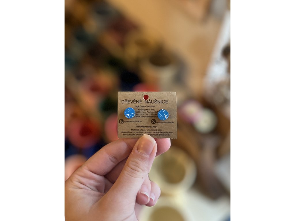 Dřevěné náušnice - Kulaté modré s bílým zdobením, malé