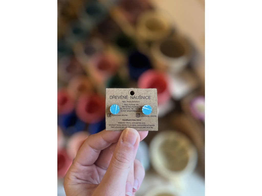 Dřevěné náušnice - Kulaté tyrkysové s bílým zdobením, malé