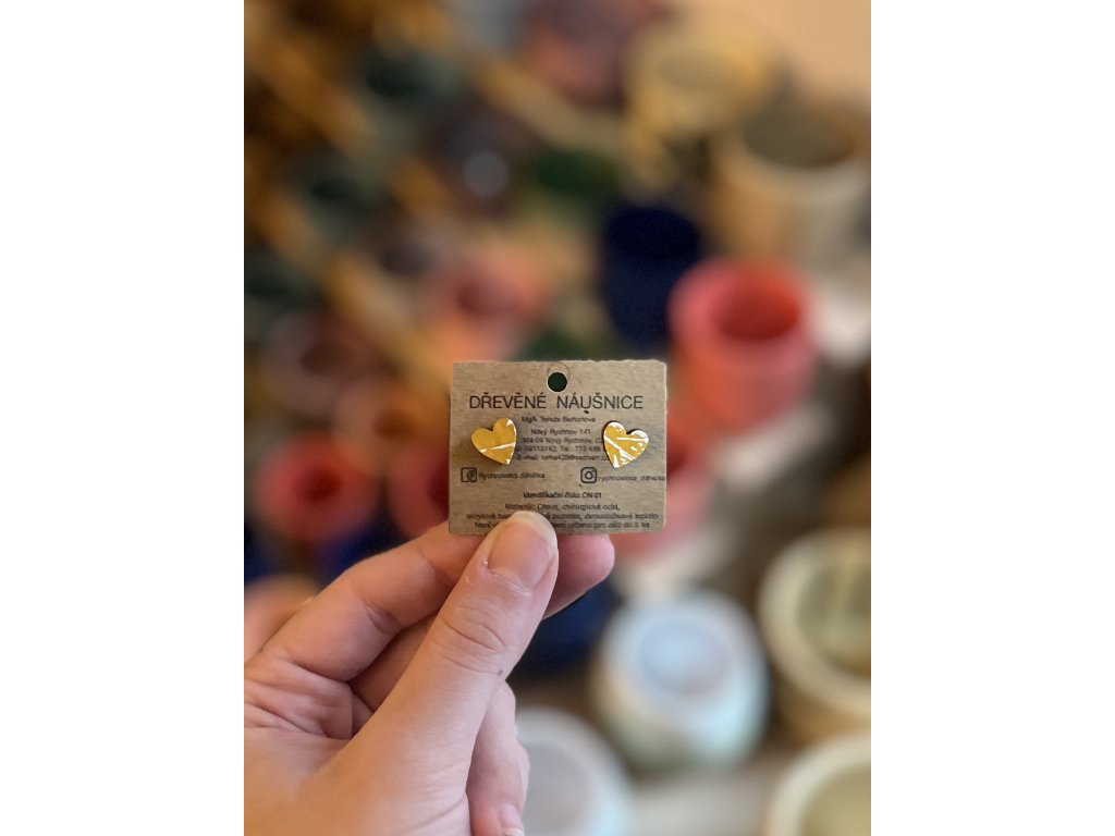 Dřevěné náušnice - Okrová srdíčka s bílým zdobením
