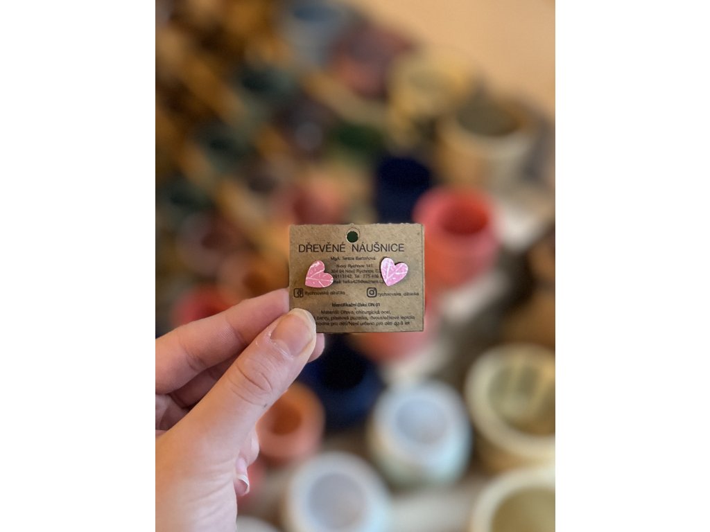 Dřevěné náušnice - Růžová srdíčka s černým zdobením