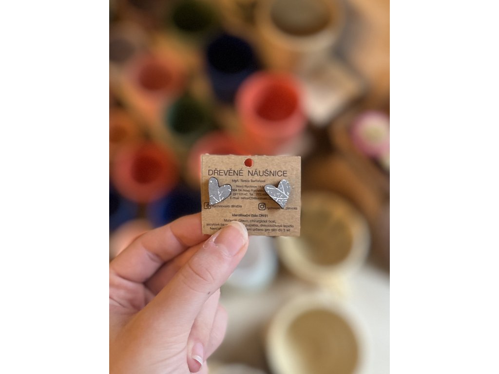 Dřevěné náušnice - Šedá srdíčka s bílým zdobením, velká
