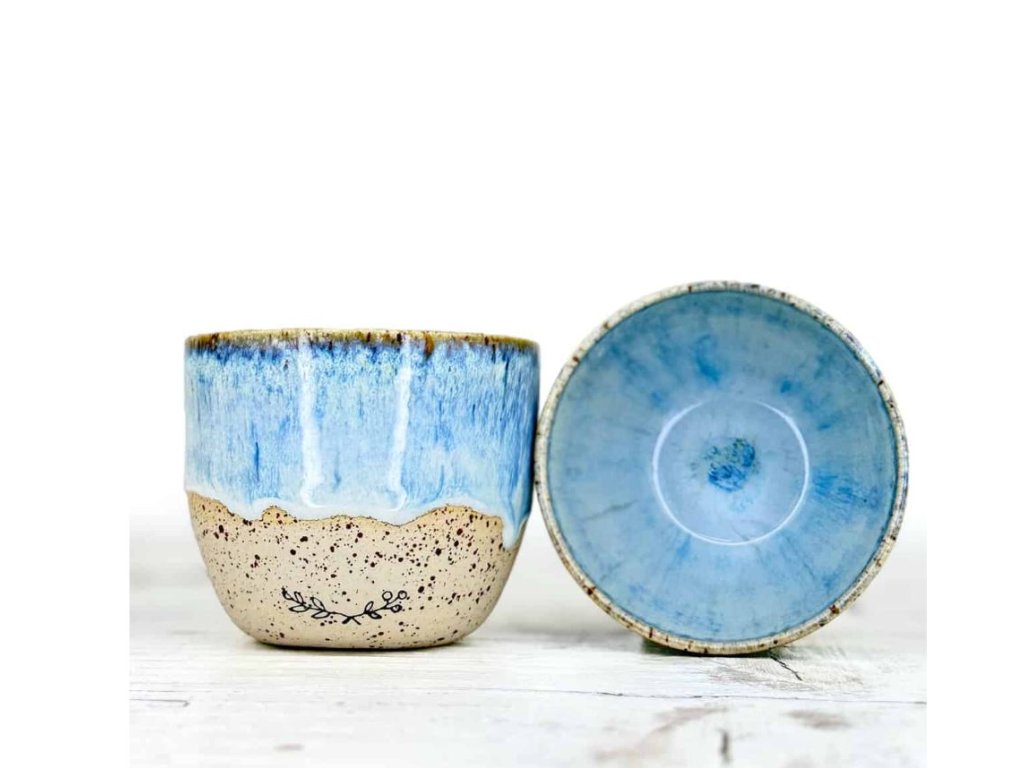 Tento kalíšek je ručně vytočen na hrnčířském kruhu z kvalitní pigmentované kameniny a následně vypálen při vysokých teplotách v elektrické peci. Jemné odchylky v objemu, měřeném až po plný okraj, slouží jako orientační hodnota.