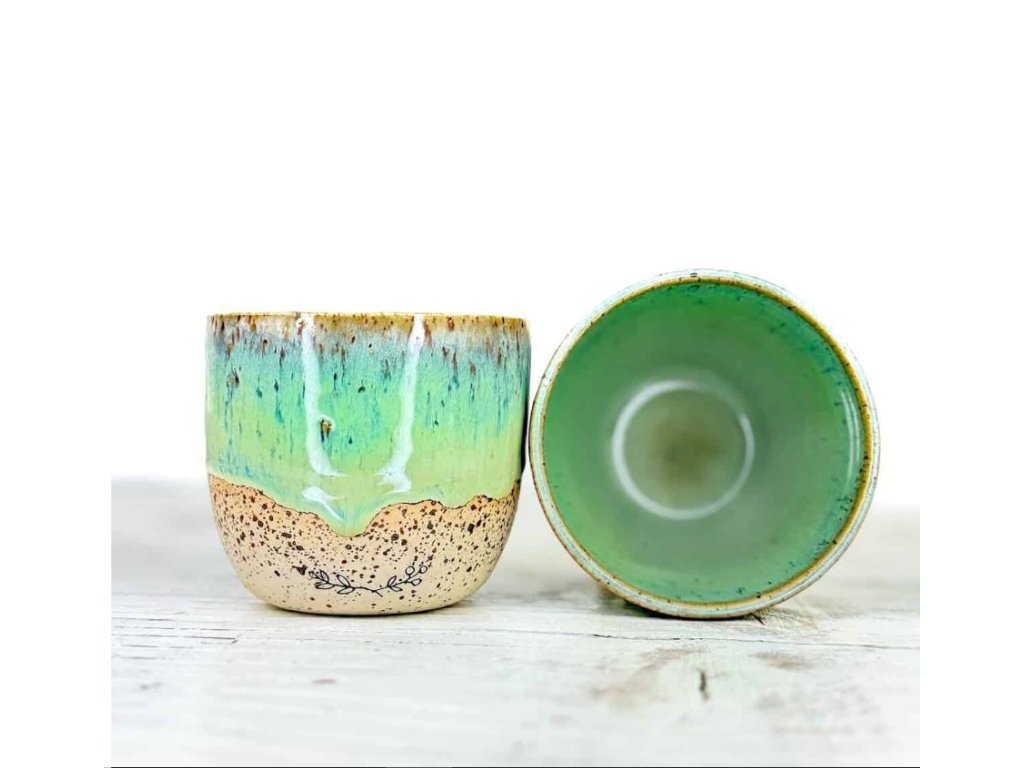 Tento kalíšek je ručně vytočen na hrnčířském kruhu z kvalitní pigmentované kameniny a následně vypálen při vysokých teplotách v elektrické peci. Jemné odchylky v objemu, měřeném až po plný okraj, slouží jako orientační hodnota.