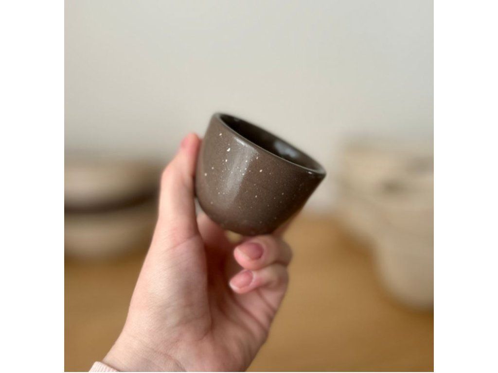 Průhledná glazura s jemnými stříkanci na světlé hlíně.