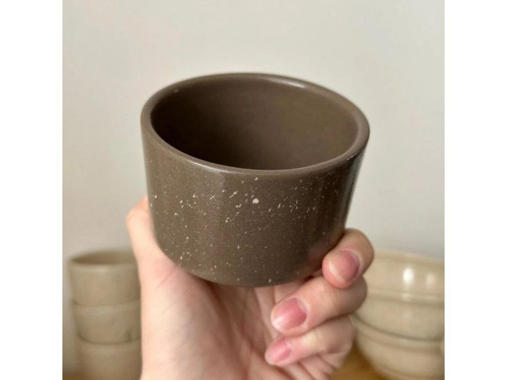 Průhledná glazura s jemnými stříkanci na tmavé hlíně.