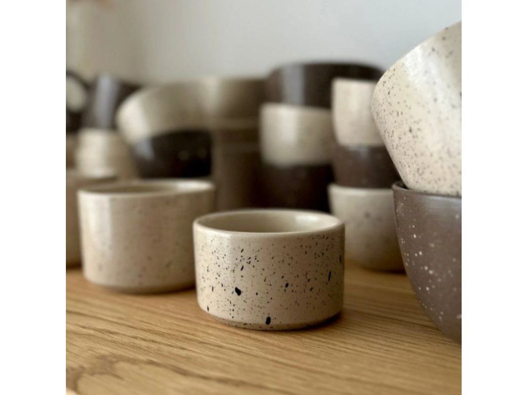 Průhledná glazura s jemnými stříkanci na světlé hlíně.