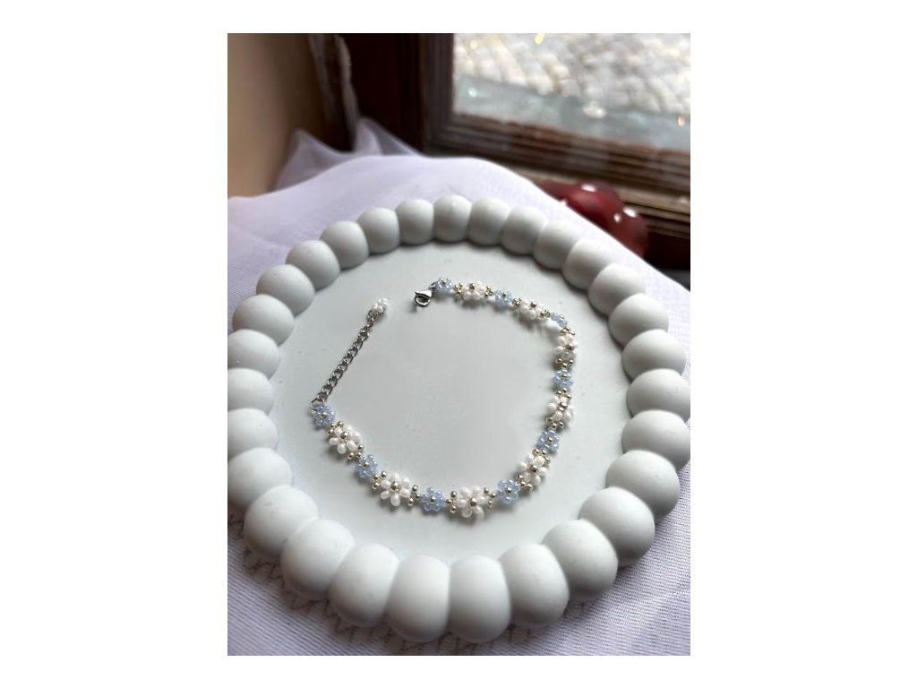 Tento půvabný květinový náramek je tou pravou volbou pro všechny, kdo milují jemnou eleganci. Krásně zpracované modro - bílé květinky se stříbrnými detaily jsou ideální volbou pro každou příležitost. Ať už si ho nasadíte na denní nošení, nebo jako doplněk k večerním šatům, tento náramek zaručeně osloví každého.