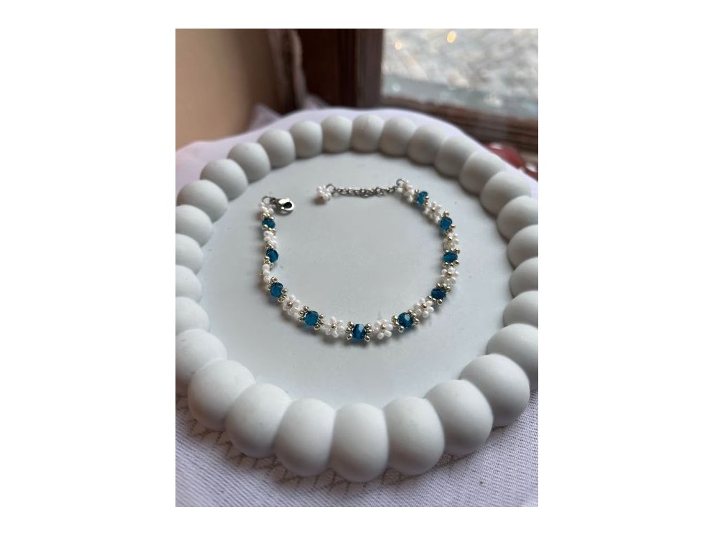 Tento půvabný květinový náramek je tou pravou volbou pro všechny, kdo milují jemnou eleganci. Krásně zpracované bílé květinky s drobným detailem v podobě tyrkysového křišťálu jsou ideální volbou pro každou příležitost. Ať už si ho nasadíte na denní nošení, nebo jako doplněk k večerním šatům, tento náramek zaručeně osloví každého.