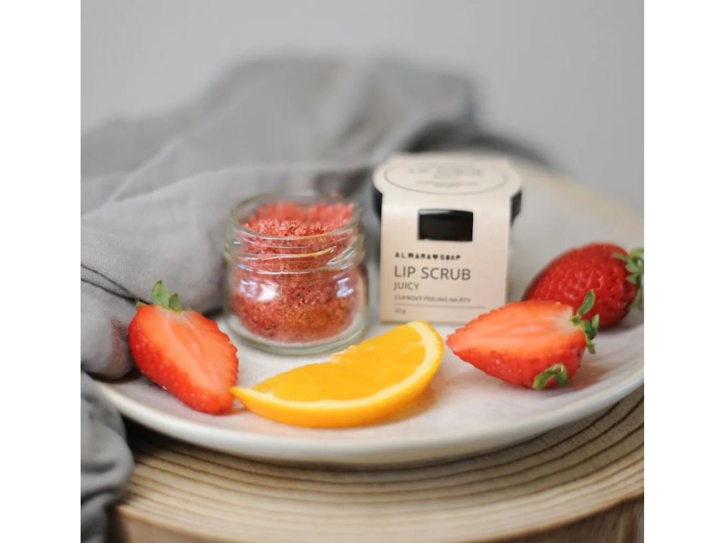 Cukrový scrub na rty je určený pro jemnou pokožku rtů, která potřebuje vyživit, zvláčnit, nebo jen tak rozmazlit. Obsahuje třtinový cukr v bio kvalitě, jahodová zrníčka a prášek, mandlový olej lisovaný za studena a bio bambucké máslo. Právě olej a máslo dodají rtům potřebnou hebkost a vláčnost. Nádhernou vůni kromě jahůdek zajišťuje 100% esenciální olej z pomeranče.
