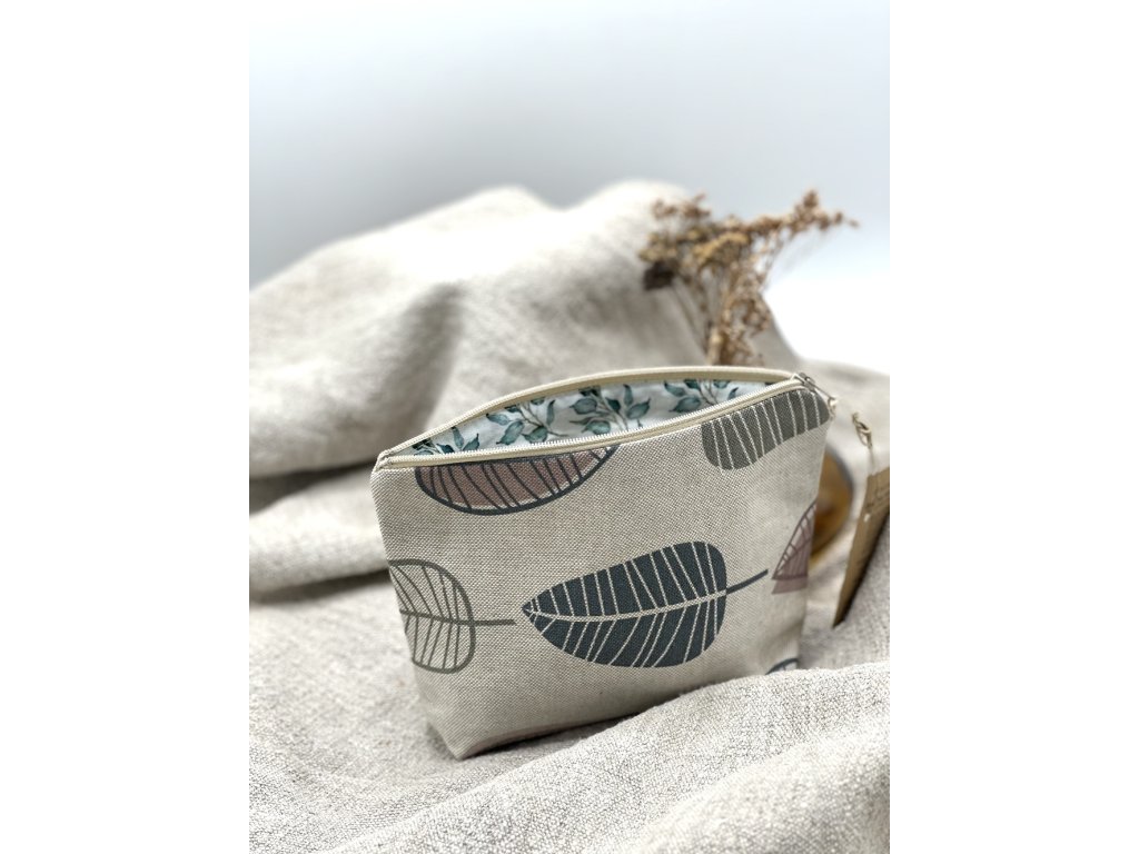 Lněná taštička s ručním tiskem a kovovým zipem