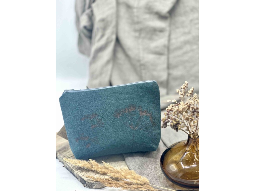 Lněná taštička s ručním tiskem a kovovým zipem