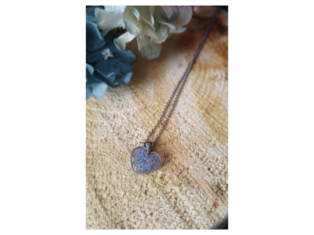 Náhrdelník a přívěsek je vyrobený z chirurgické oceli. Přívěsek je ve tvaru srdce, ve kterém jsou v křišťálové pryskyřici zalité sušené květy pomněnek. Náhrdelník je dlouhý cca 45 cm.