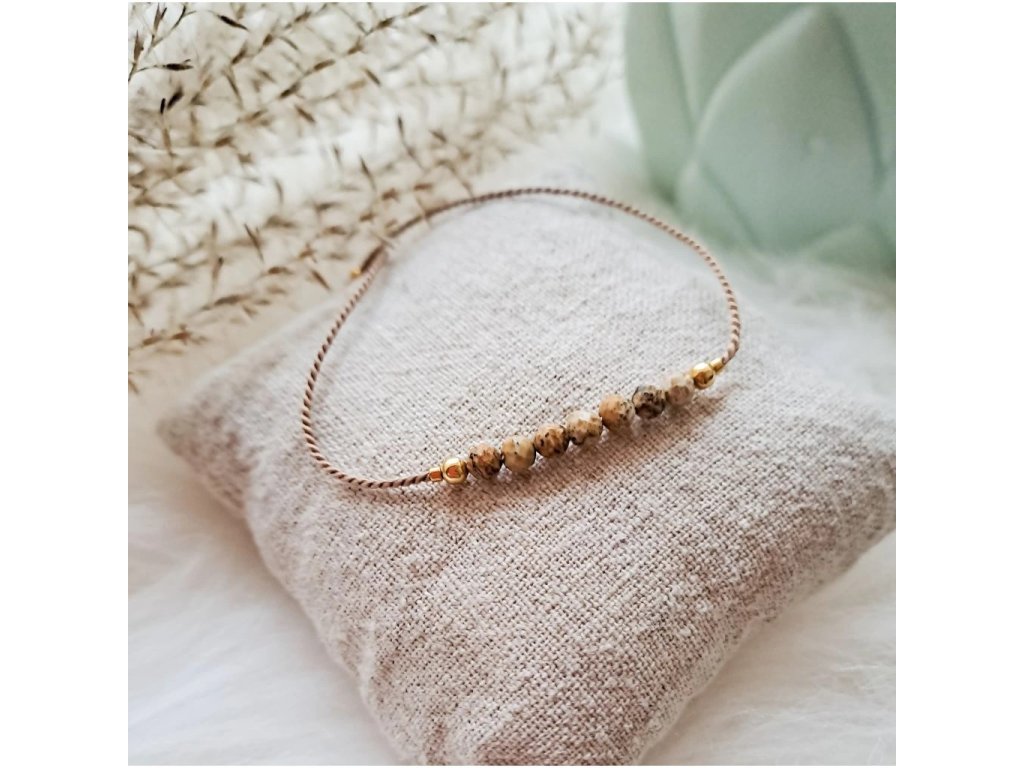 Fazetované korálky Jaspisu jsou navlečeny na béžové šňůrce z hedvábí a po stranách ozdobeny pozlacenými korálky ze stříbra Ag925 vel. 3mm.