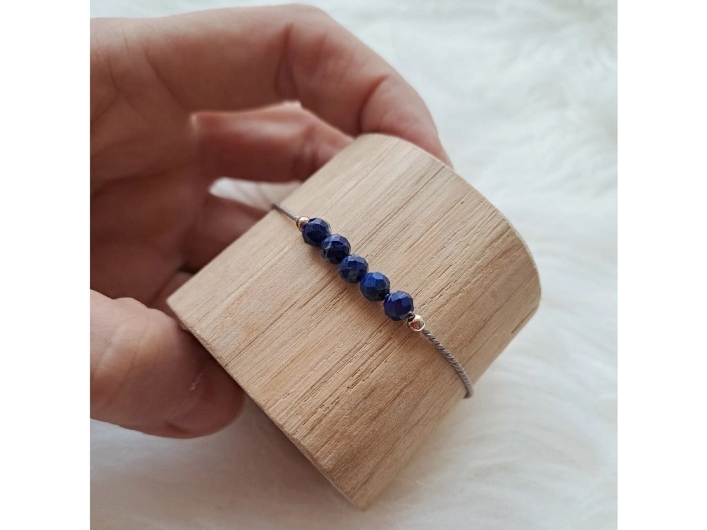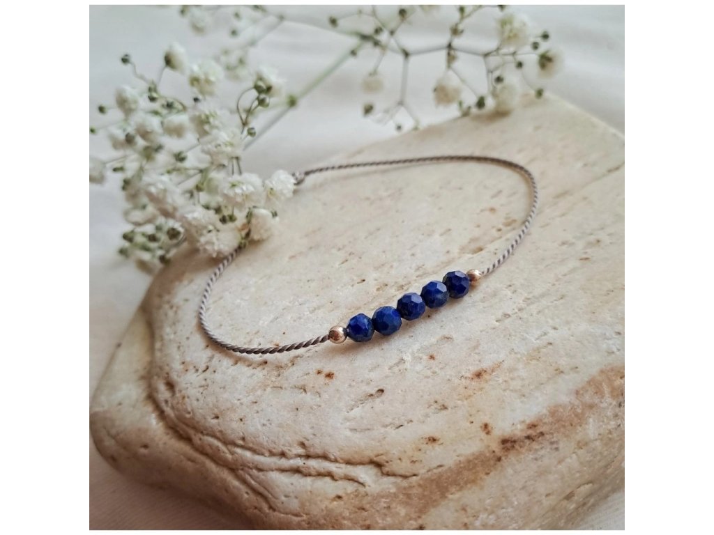 Fazetované kuličky Lazuritu (nazýván též Lapis Lazuli) na hedvábné šňůrce v šedé barvě, po stranách ozdobeny korálky ze stříbra Ag925.