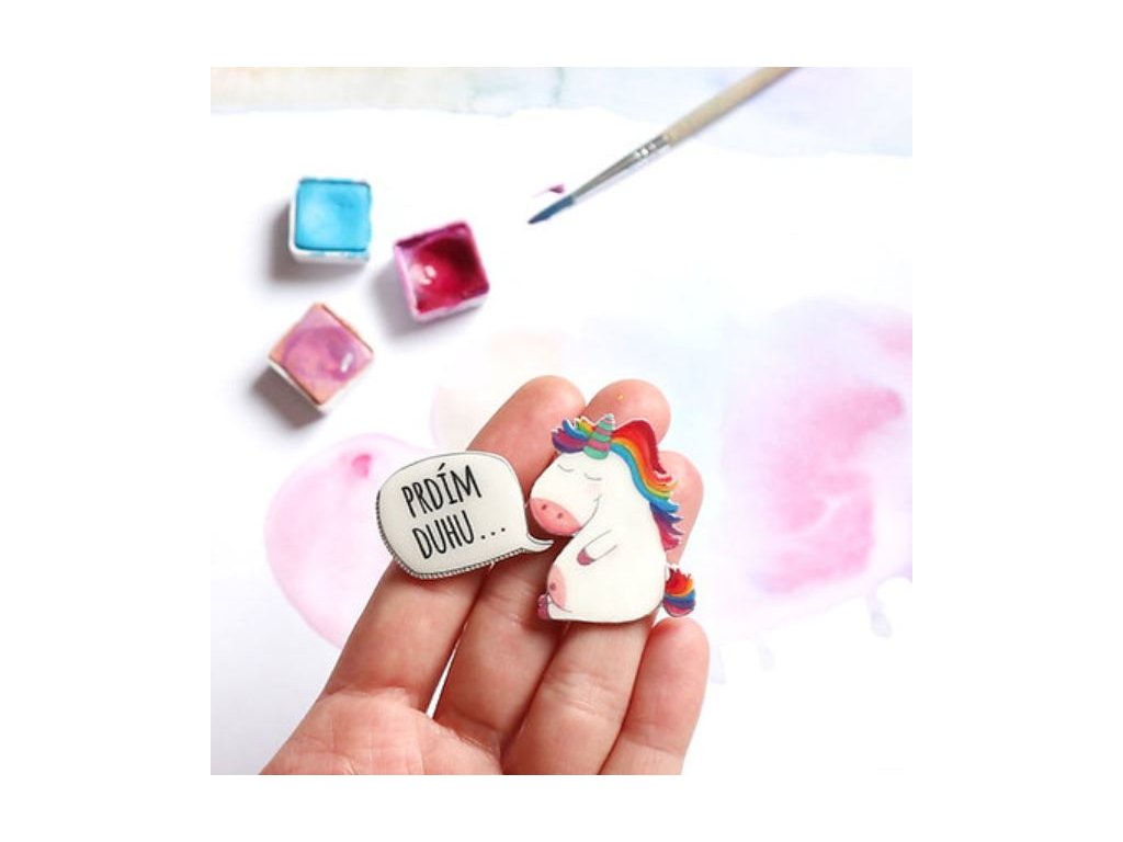 Tento veselý jednorožec je motiv malovaný akvarelkami. Poté přenesen na speciální polymer a s péčí a zafixován aby Vám brož vydržela co nejdéle. Brož je zalitá pryskyřicí, takže povrch je hezky lesklý. Zapínání na brožový můstek, obě části lze nosit zvlášť nebo dohromady, podle nálady :-)