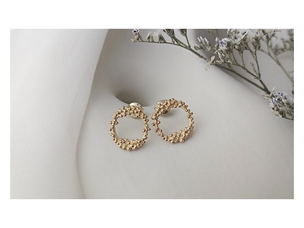 Minimalistické náušnice z pozlaceného stříbra, zdobené drobnými kuličkami jako kapkami rosy. Jemná struktura působí lehce a svěže, s jemným třpytem při pohybu.