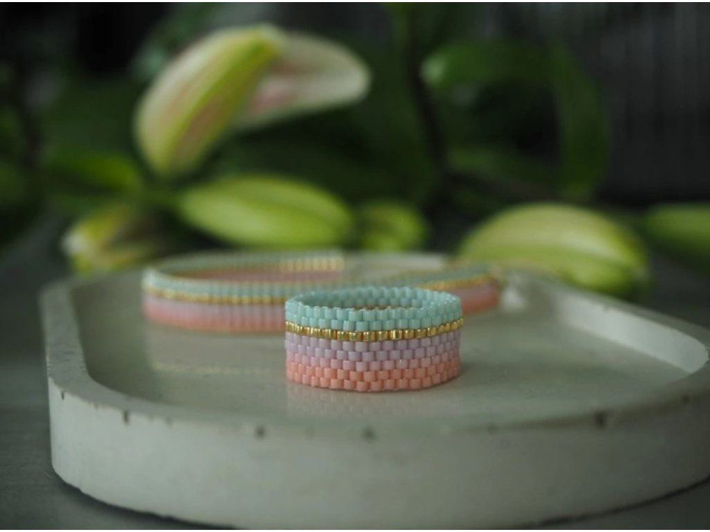 Prstýnek z prémiových japonských Miyuki korálků, ručně šitý časově náročnou technikou stehem Peyote. Je netradiční a je též nepřehlédnutelnou ozdobou ženské ruky, ve svěžích letních barvách. Šitý vysokopevnostní nití. Každému prstýnku se vždy pečlivě věnuji a po sešití jej znovu celý prošívám. To zajišťuje jeho pevnější tvar a delší výdrž.