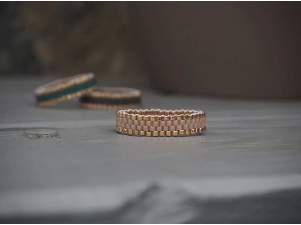Prstýnek z kvalitních japonských Miyuki korálků ručně šitý časově náročnou technikou stehem Peyote. Je netradiční a je též nepřehlédnutelnou ozdobou ženské ruky. Šitý vysokopevnostní nití. Každému prstýnku se vždy pečlivě věnuji a po sešití jej znovu celý prošívám. To zajišťuje jeho pevnější tvar a delší výdrž.