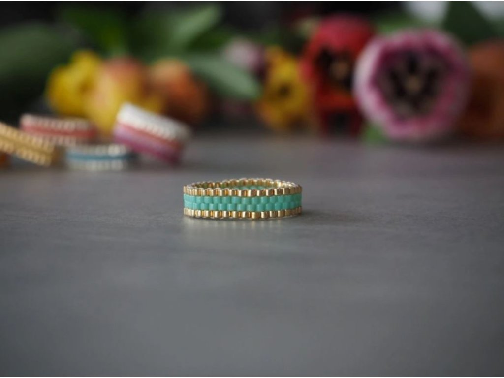 Prstýnek z kvalitních japonských Miyuki korálků ručně šitý časově náročnou technikou stehem Peyote. Je netradiční a je též nepřehlédnutelnou ozdobou ženské ruky. Šitý vysokopevnostní nití. Každému prstýnku se vždy pečlivě věnuji a po sešití jej znovu celý prošívám. To zajišťuje jeho pevnější tvar a delší výdrž.
