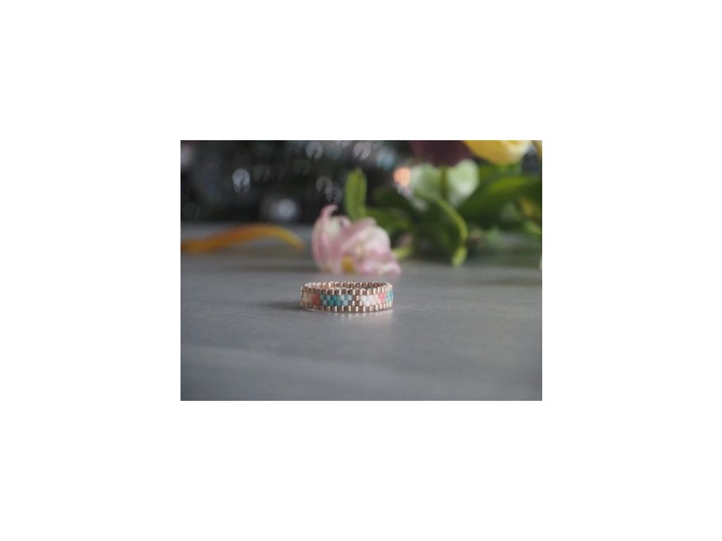Prstýnek z kvalitních japonských Miyuki korálků ručně šitý časově náročnou technikou stehem Peyote. Je netradiční a je též nepřehlédnutelnou ozdobou ženské ruky. Šitý vysokopevnostní nití. Každému prstýnku se vždy pečlivě věnuji a po sešití jej znovu celý prošívám. To zajišťuje jeho pevnější tvar a delší výdrž.