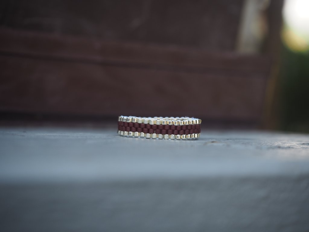 Prstýnek z kvalitních japonských Miyuki korálků ručně šitý časově náročnou technikou stehem Peyote. Je netradiční a je též nepřehlédnutelnou ozdobou ženské ruky. Šitý vysokopevnostní nití. Každému prstýnku se vždy pečlivě věnuji a po sešití jej znovu celý prošívám. To zajišťuje jeho pevnější tvar a delší výdrž.
