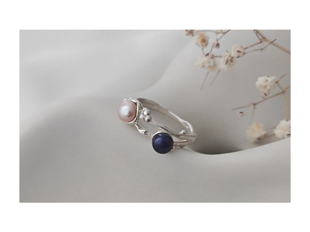 Stříbrný prsten s organickými liniemi propojuje jemnou růžovou a tajemně modro-černou perlu, čímž vytváří jedinečný kontrast plný elegance.