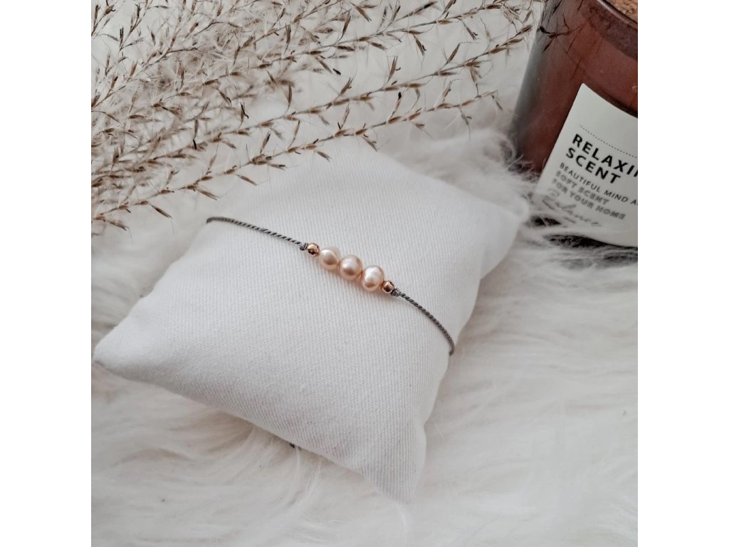 Tři říční perly v lososovém odstínu navlečené na šedé šnůrce z hedvábí. Po stranách jsou perličky zdobeny růžově zlacenými korálky ze stříbra Ag925 vel. 3mm.