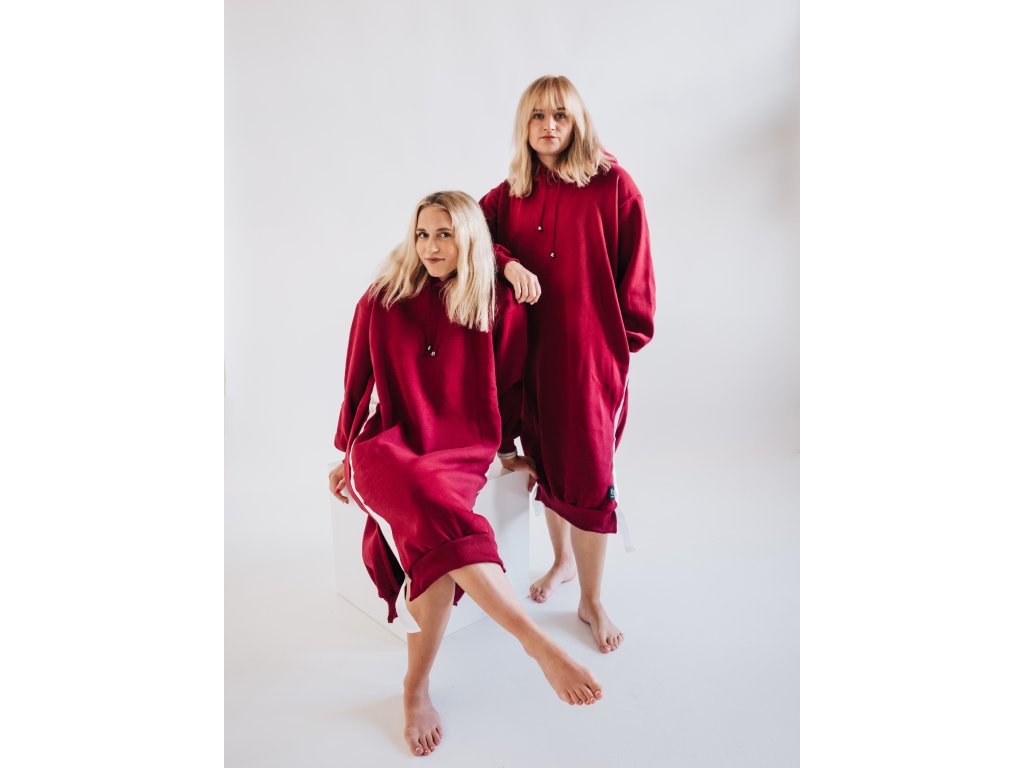 Tyhle ultra pohodlné šaty jsou šité z vysoko gramážní počesané teplákoviny (80% bavlna, 20% polyester). Jsou pěkně měkoučké a teplé. Střih je volný pro maximální pohodlí a je doplněn rafinovaným bílým lampasem. Na tomto střihu také nechybí kapsy schované do švu a dvojitá kapuce, aby pěkně držela. Hodí se jak do města, tak někam na procházku.