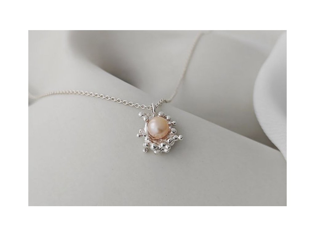 Náhrdelník, který odráží krásu přírody a pohyb mořských vln. Jemné organické linie zdůrazňují něžnost lososově růžové perly.