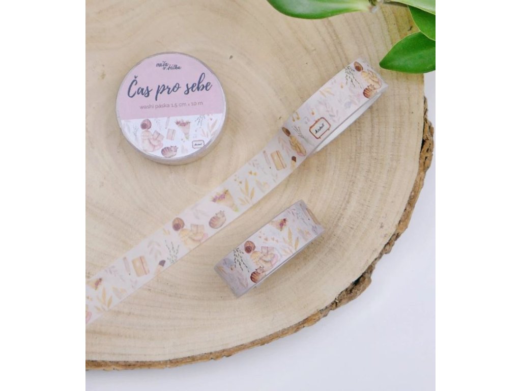 Washi páska Čas pro sebe je ozdobená autorskou akvarelovou ilustrací, kterou jsme zasadili do hnědorůžového pozadí. Využijete ji na zdobení diáře, k ozdobení fotoalba nebo třeba na přichycení fotek na stěnu. Dokonale něžný motiv potěší nejen každou plannerku a knihomolku, ale zkrátka každého, kdo neodolá jemné, hygge ilustraci.