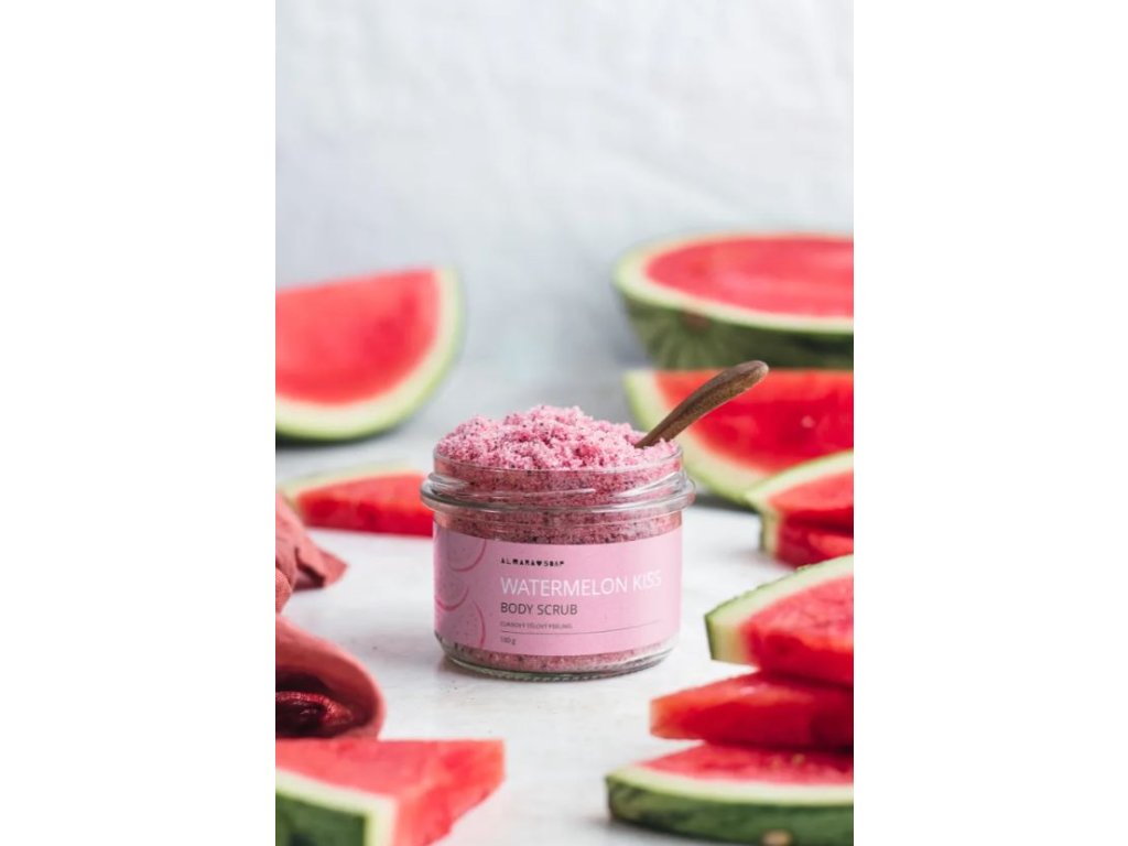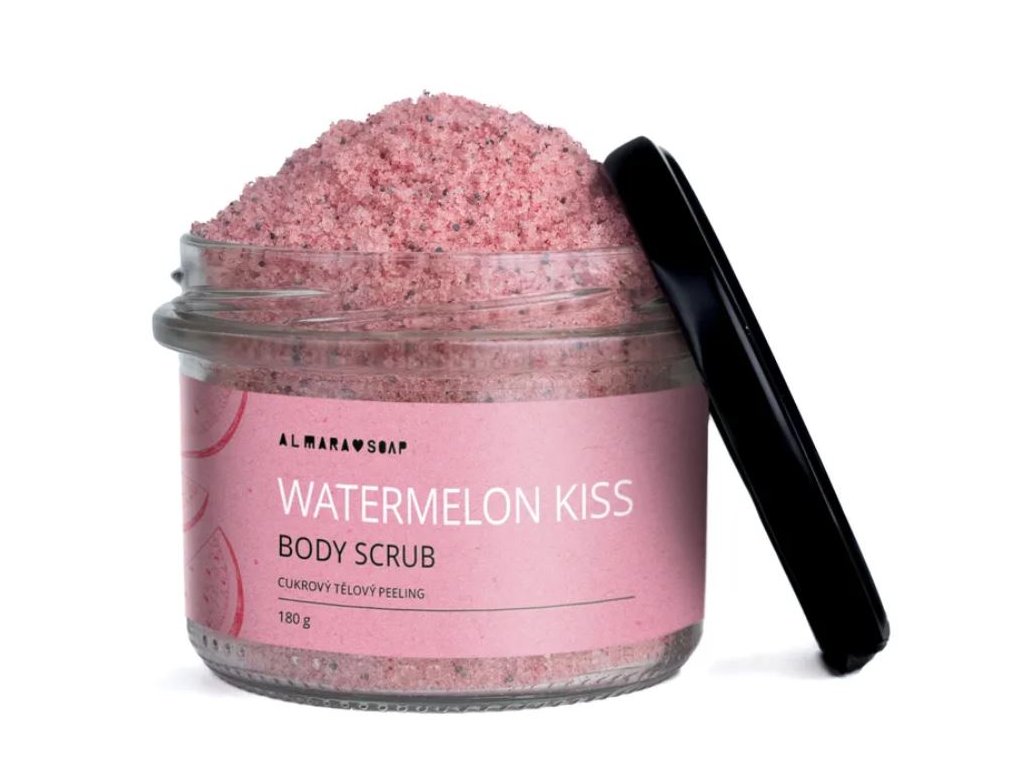 Watermelon Kiss má základ z jemně mleté mořské soli a bio třtinového cukru. Dále je obohacený o rostlinné oleje – slunečnicový a ricinový lisovaný za studena, díky kterým peeling krásně klouže po pokožce a zároveň ji vyživí. Peelingový efekt doplňují maková zrníčka. Po opláchnutí zůstane pokožka promaštěná a není třeba používat tělové mléko či olej. Složení doplňuje čistě přírodní barvivo ve formě prášku z lyofilizovaného ovoce.